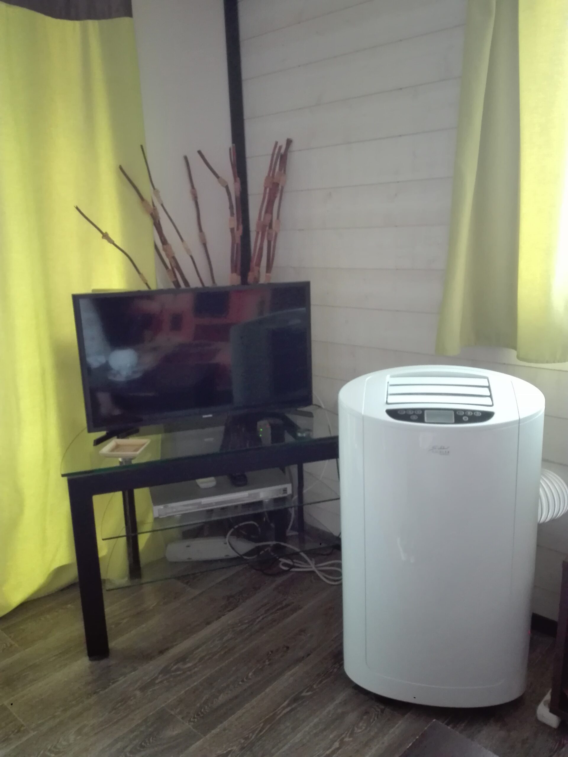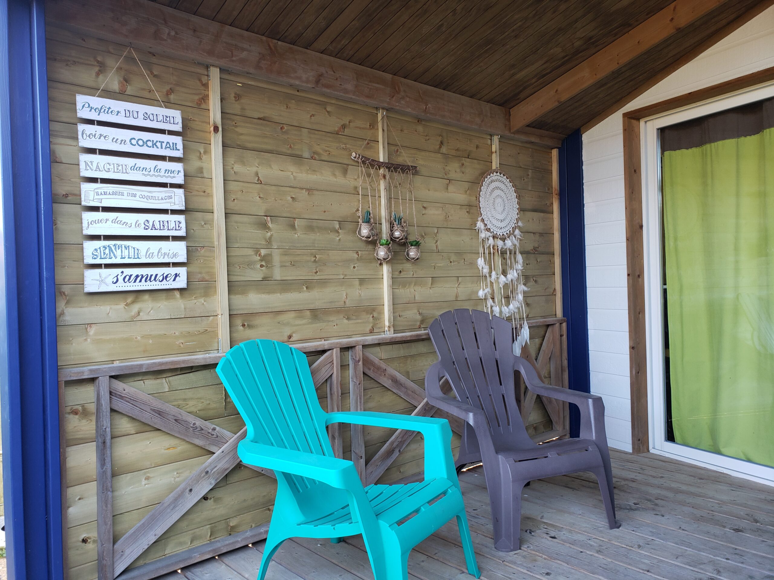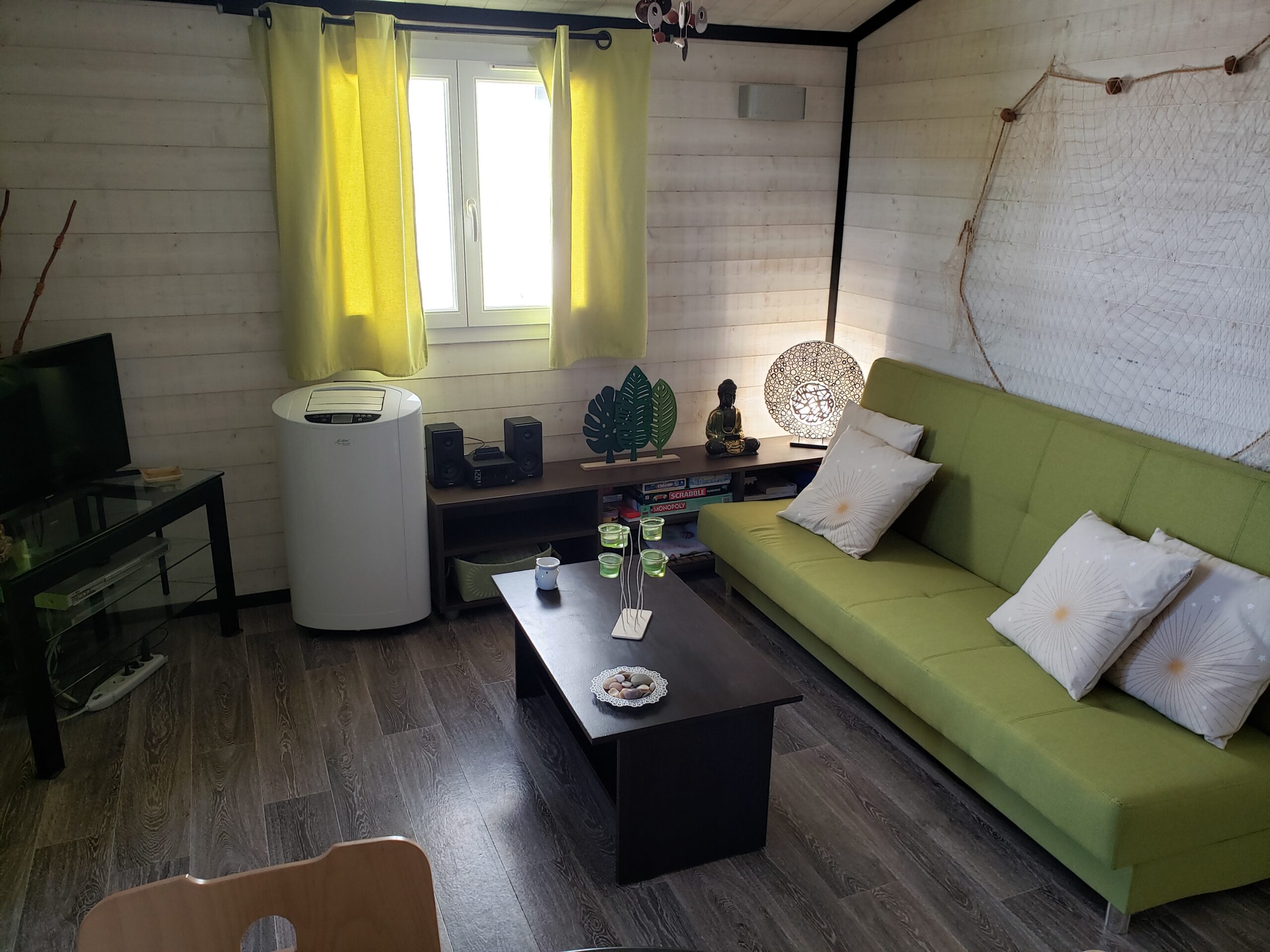 - d’un séjour (banquette clic-clac, TV TNT écran plat + lecteur DVD, mini chaine-Hifi avec port USB, 1 module de climatisation).
