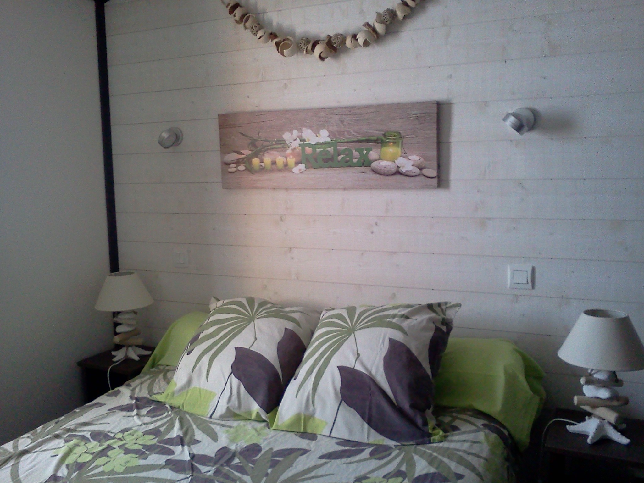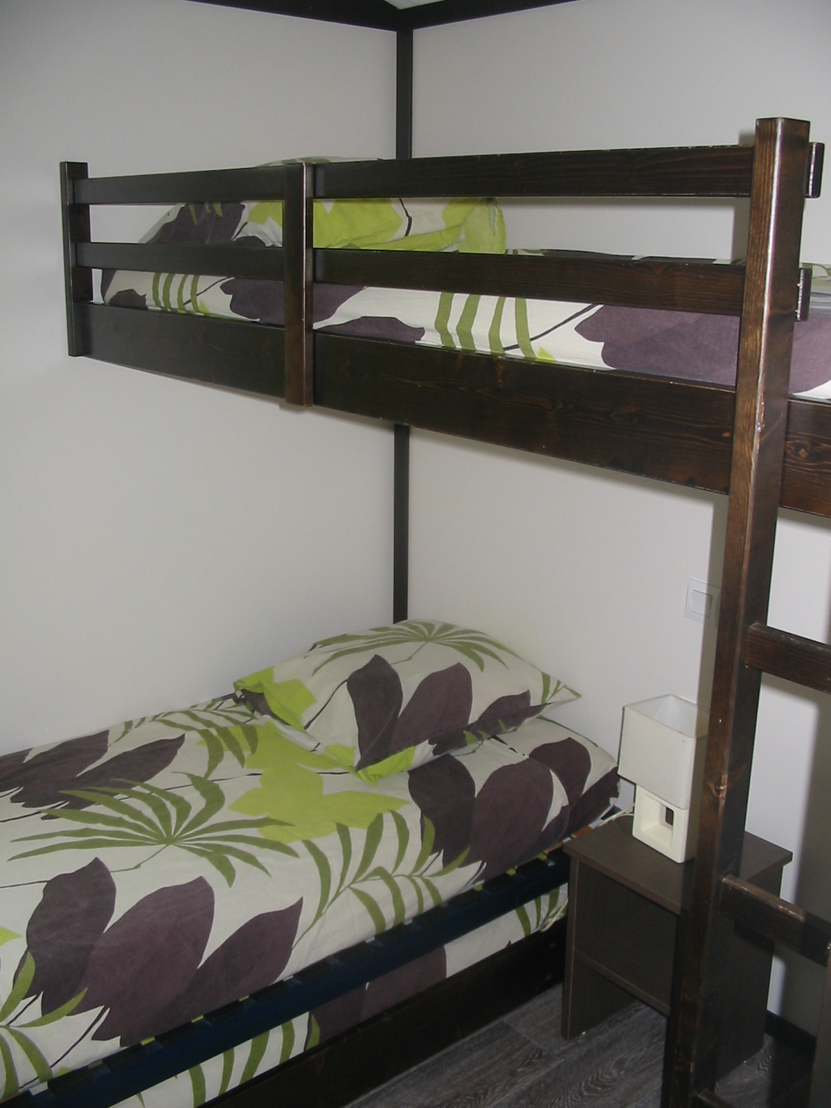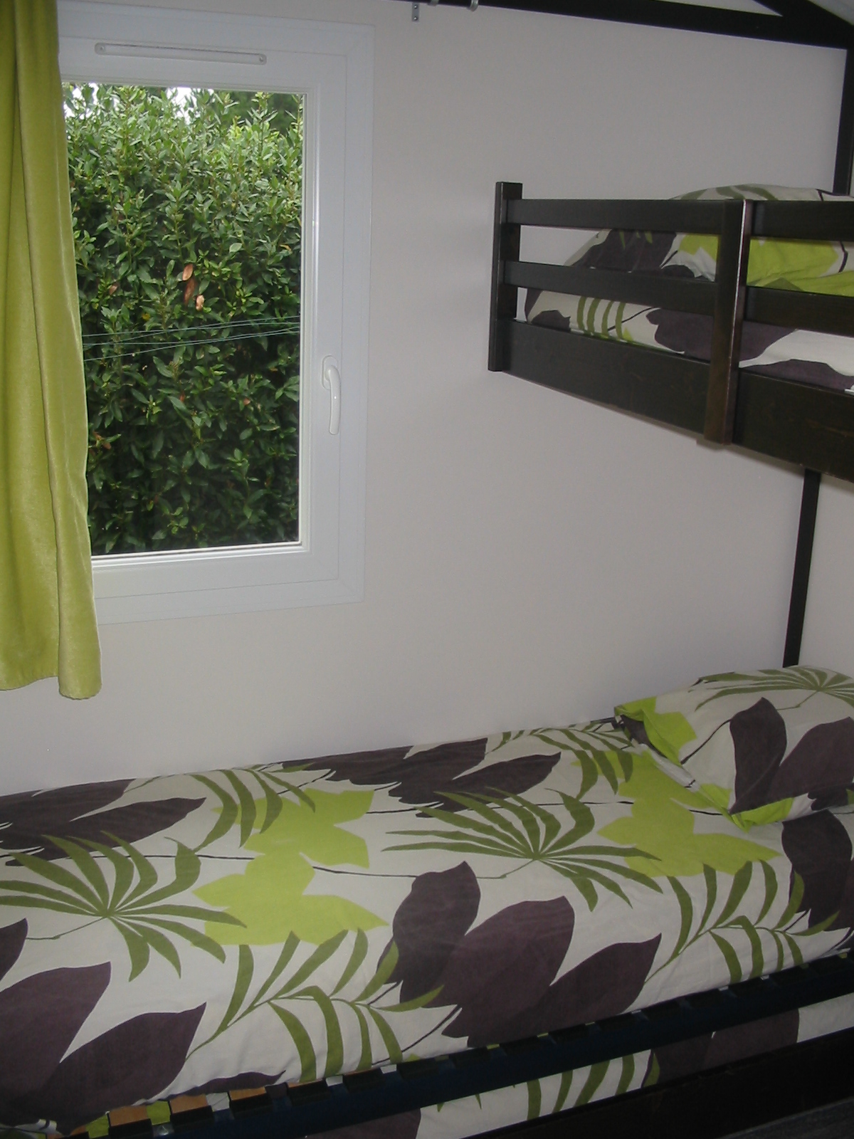 - d’une chambre avec 3 lits 1 personne: 1 en mezzanine (pas très haut) et 2 lits jumeaux que l’on peut mettre côte à côte pour un couple (pour faire un grand lit). Un lit bébé peut être placé sur demande (gratuitement) à la place d’un des lits jumeaux. Les couettes, alèses, les draps et les oreillers sont fournis… tout est prêt à votre arrivée !
